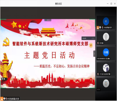 (通讯员 张恒运)为庆祝中国共产党建党100周年,深入学习贯彻习近平总书记在党史学习教育动员大会上的重要指示精神,从党的非凡历程和实践中汲取初心使命的力量,太阳成集团tyc234cc智能软件与系统新技术研究所本硕博师联合党支部于2021年5月28日下午开展了“重温党史,不忘初心,发扬古田会议精神”主题党日活动。活动由支部副书记吕文琪同志主持,共计56人参加,会议以线上和线下的方式进行展开。
