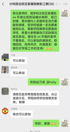 12月底,按照疫情防控办要求,北校区家属院全面严格执行小区封闭管理,落实人员“只进不出”要求,个别楼栋全面封闭,需要大量志愿者保障核酸检测等疫情防控措施顺利进行。公司北校区家属院44号楼出现新冠确诊病例封楼期间,公司组建一支志愿者服务队伍,对楼内人员提供生活方面服务保障,公司需要1名老师参加公司志愿者队伍,通知一发即有9位包括党政领导班子在内的老师积极报名,分别是刘锦辉,万波,霍秋艳,杜军朝,高悦,刘惠,王献青,李青山,张卫东。同时付少锋、黄伯虎、吴自力、杜军朝、张淑平、刘伟和霍秋艳等老师在南北校区积极参与社区防控工作。
