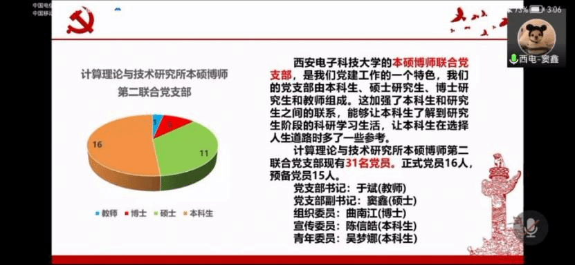 首先,西电计算理论与技术研究所本硕博师第二联合党支部副书记窦鑫与西交电气公司南洋书院师生联合第三党支部书记佘晓亮分别介绍了党支部基本情况,西电计算理论与技术研究所本硕博师第二联合党支部由1名教师和硕、博士生党员和本科生党员组成,西交电气公司南洋书院师生联合第三党支部由2名教师和本科生党员组成,两支部均包含大量的积极分子和员工群众。