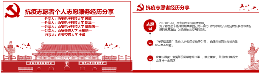 最后,双方党支部员工代表分享了抗疫志愿服务经历。西电的曾诚作为核酸检测医生助手,从一个旁观者的角度描述了核酸检测人员的不易,动情于他们的奉献也更加使人们热爱这片土地和在此生活的无数可爱的人们;西电的郑昊和彭雅倩也分享了自己作为抗疫物资搬运志愿者的收获和感悟,更加认识到“奉献”是最大的幸福,全心全意为人民服务是中国共产党的根本宗旨。西交的王栩韬分享了作为核酸志愿者的工作经历,每天都要穿着层层的防护服,甚至连上厕所和喝水都受到限制,但同学们从不喊累,能够为同学们服务是最大的幸福;西交的王勇分享了拍照记录疫情期间志愿服务的经历,一帧帧的画面将疫情中的温情定格,苦难终将过去,但奉献和善意永不过时。