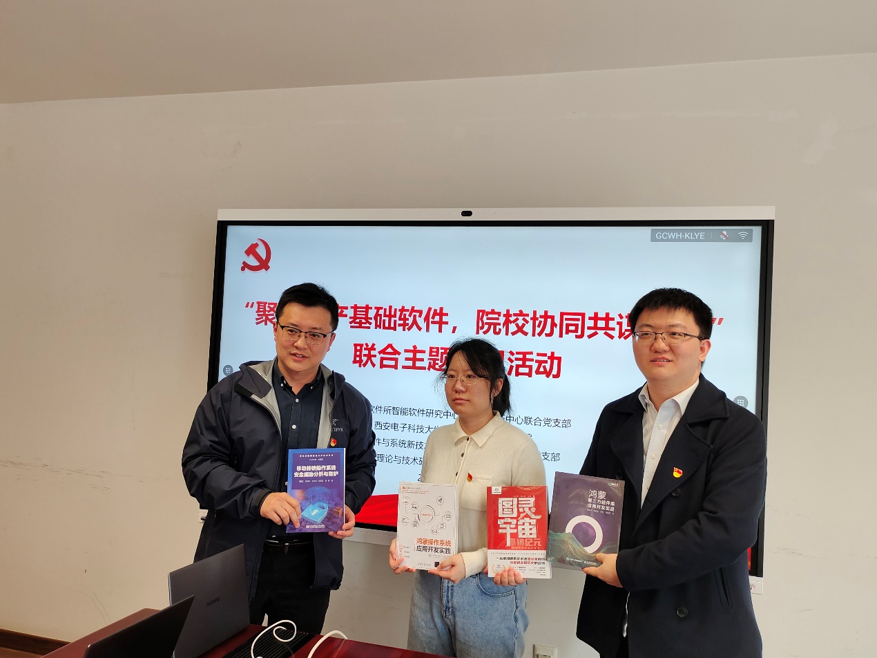 在赠书环节,中科院软件所向西电太阳成集团tyc234cc赠送了支部成员参与编写并出版的《图灵宇宙:原初纪元》、《鸿蒙操作系统应用开发实践》等专业书籍。