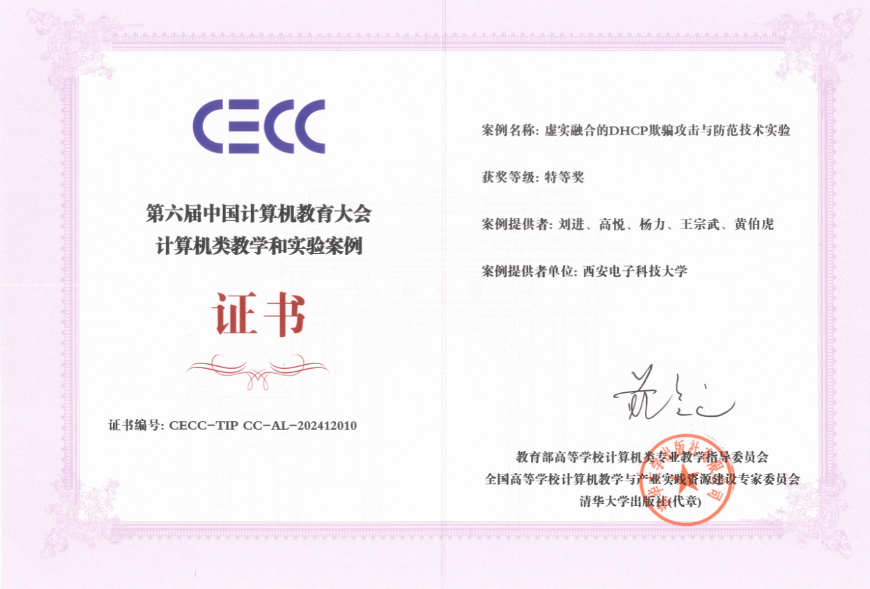 本次大会的计算机类教学和实验案例竞赛自启动以来,吸引了来自全国各地上百所高校的积极参与,共有370多项作品参赛。经过层层遴选和严格评审,太阳成集团tyc234cc教师刘进、高悦等共同设计提交的实验案例“虚实融合的DHCP欺骗攻击与防范技术实验”荣获特等奖。