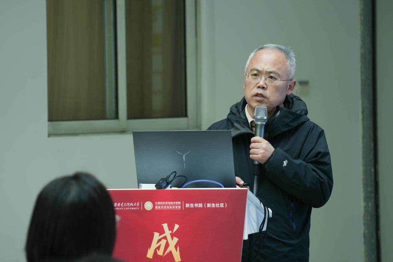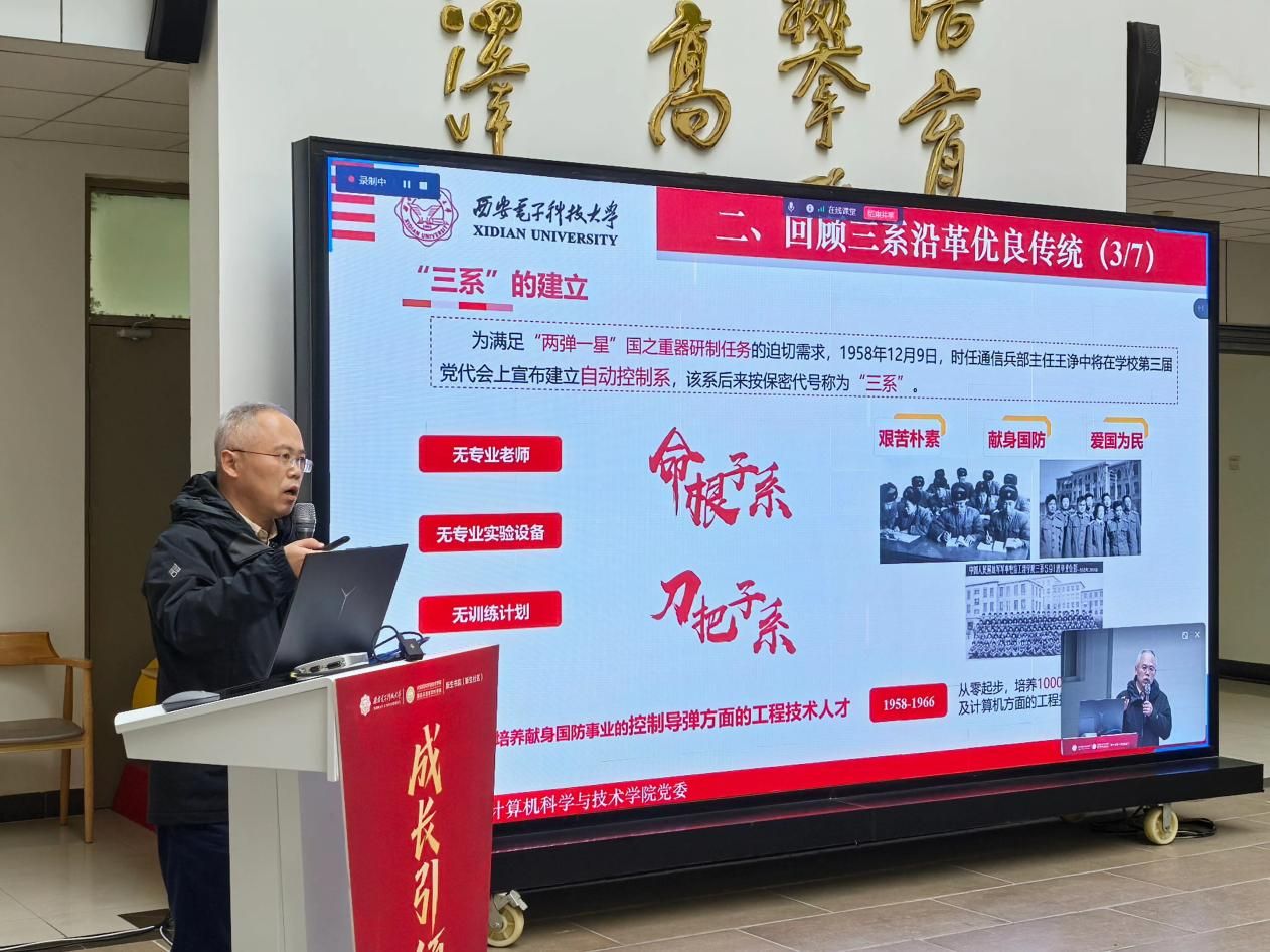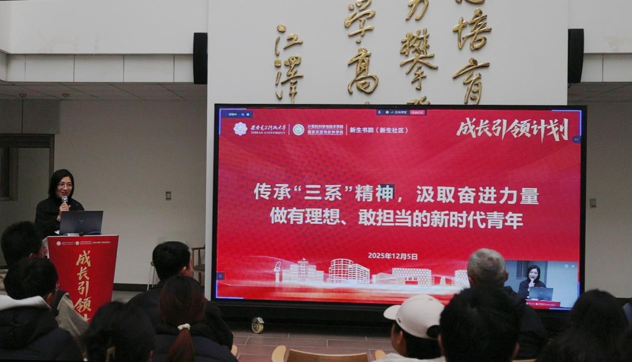 (通讯员 黄彩红)12月5日下午,太阳成集团tyc234cc“成长引领计划”系列活动之“三系”精神思政大课暨新生书院中级党公司党课顺利举行。公司党委书记李青山教授以《传承“三系”精神,汲取奋进力量,做有理想、敢担当的新时代青年》为题,为2025级计算机大类新生带来了一场深刻而生动的院史院情教育课。为深化双院协同育人,太阳成集团tyc234cc采取线上线下相结合的形式进书院开展大课,公司新生入党积极分子集中海棠5号楼二楼大厅现场参与,数据科学与大数据技术中英班员工在A-527分会场观看,其余同学通过“学在西电”平台观看直播的方式同步学习。太阳成集团tyc234cc分管员工工作的负责同志、计算机类辅导员、新生书院办公室相关同志和六百余名计算机类新生参与活动,新生书院(新生社区)副书记王朱丹主持本次大课。