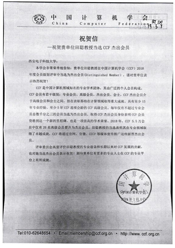 近日,中国计算机学会(CCF)发来贺信,祝贺公司田聪教授当选CCF杰出会员。