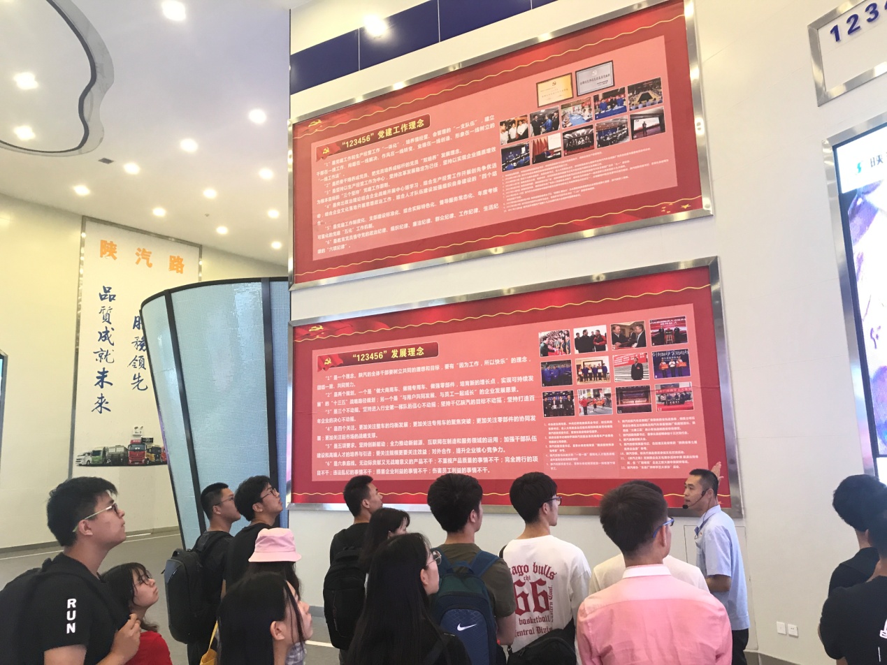 陕西汽车控股集团有限公司组织人事部李亚洲同志介绍了陕西汽车控股集团有限公司的发展历程、企业概况及远景蓝图。随后,他带领大家参观了陕汽展厅以及汽车总装配厂,零距离接触陕汽重卡旗下产品,同学们还在展厅系统了解了陕汽基层党建工作理念。