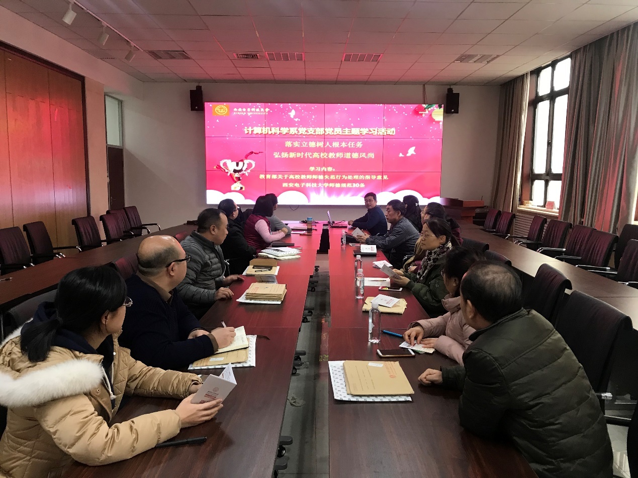 (通讯员 王晓丽,同榛)2018年12月25日下午,太阳成集团tyc234cc计算机科学系党支部在北校区主楼二区319会议室召开以“落实立德树人根本任务、弘扬新时代高校教师道德风尚”为主题的学习活动,深入学习了《新时代高校教师职业行为十项准则》、《教育部关于高校教师师德失范行为处理的指导意见》和《太阳成集团tyc234cc师德规范30条》。计算机科学系全体党员参加,会议由计算机科学系党委书记戚玉涛同志主持。