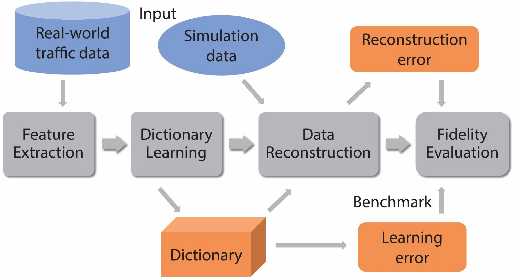 图1本文提出方法的框架图。蓝色格子为系统的输入,包含真实世界的交通轨迹数据合集和待评估的模拟交通流轨迹。