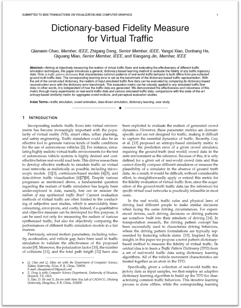 Qianwen Chao, Zhigang Deng, Yangxi Xiao, Dunbang He, Qiguang Miao, XiaogangJin,Dictionary-based Fidelity Measure for Virtual Traffic,IEEE Computer Society, 2018, 24.