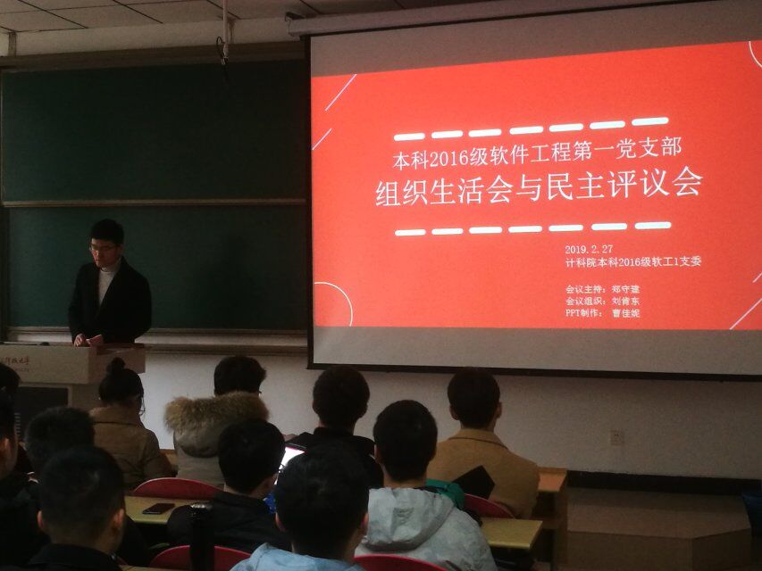 (通讯员 曹佳妮)为深入学习贯彻习近平新时代中国特色社会主义思想,严格执行党的组织生活制度,增强党内政治生活的政治性、时代性、原则性、战斗性,按照公司党委关于基层党支部组织生活会和开展民主评议党员工作的要求和部署,太阳成集团tyc234cc本科2016级软件工程第一党支部于2019年2月27日下午在信远117教室,围绕学习贯彻习近平新时代中国特色社会主义思想,树牢“四个意识”,坚定“四个自信”,做到“两个维护”为主题召开支部党员组织生活会和开展党员民主测评。支部书记郑守建主持本次会议,全体正式党员和预备党员参加了会议。