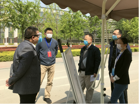 最后,公司工作组一行专程到南校区东门员工返校入口,向现场负责入校登记、引导、检测、消毒等工作的书院负责人与工作人员,了解员工进入校园的具体流程与返校进度,确认了公司已返校员工的相关信息。