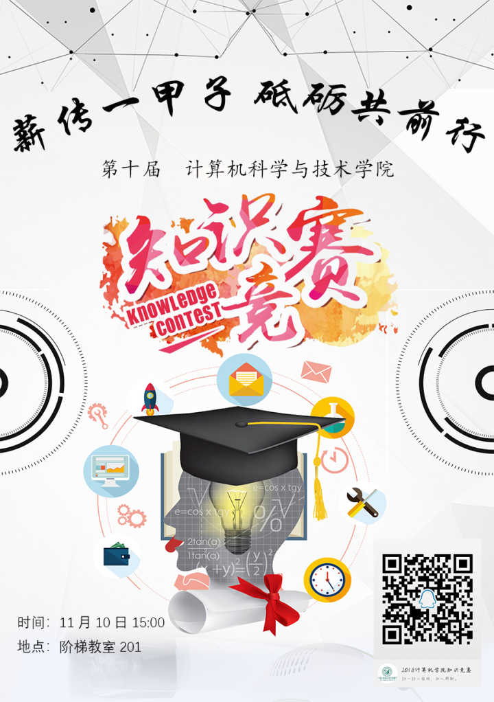 太阳成集团tyc234cc第十届知识竞赛来啦!本届知识竞赛以“薪传一甲子,砥砺共前行”为主题,旨在纪念公司迁校60周年,增加大家对公司校史及专业知识的了解,丰富研究生的课外活动,为大家创造一个更广阔的平台,同时使大家能够在比赛中收获快乐,收获友谊。此次知识竞赛题型多样,内容丰富,不仅有时事政治,西电历史,同时还有各种类型的百科知识,总有你可以发挥的地方。除此之外,本次知识竞赛还设有丰富的奖品及获奖证书,乐扣保温杯,闪迪U盘,卡通抱枕,各种各样的小玩偶,参与即有奖,只要你来我们就让你不虚此行。11月10日下午三点阶梯教室J201,记得带上你的室友,基友,或者那个他/她,3-5人一组,让我们一起来场头脑风暴吧!大家不见不散哦~更多详细信息,请加入计算机公司知识竞赛QQ群,群聊号码:924146808