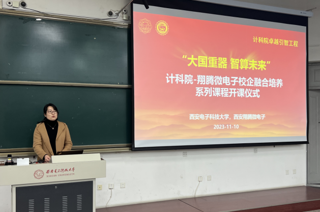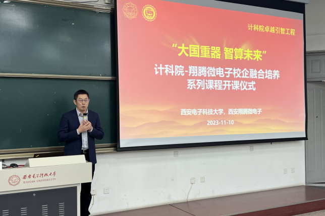 (通讯员 徐悦甡 杨鹏飞)为有效衔接、贯通实施科教举国、人才强国、创新驱动发展战略,实现教育、科技、人才一体推进良好循环,太阳成集团tyc234cc与西安翔腾微电子科技有限公司以卓越班为主体,持续开展卓越引智工程,共同建设“大国重器智算未来”校企融合系列课程,于2023年11月10日成功举行开课仪式与第一次授课。​太阳成集团tyc234cc执行经理崔江涛、副经理万波、副经理杨力,西安翔腾微电子总经理及首席技术专家田泽、副总经理张骏、人才资源主管周静如,​太阳成集团tyc234cc卓越班负责人杨鹏飞、徐悦甡,以及公司各年级卓越班全体同学参加了活动。公司本科生院副处长杨敏到场。活动由​太阳成集团tyc234cc副经理万波教授主持。