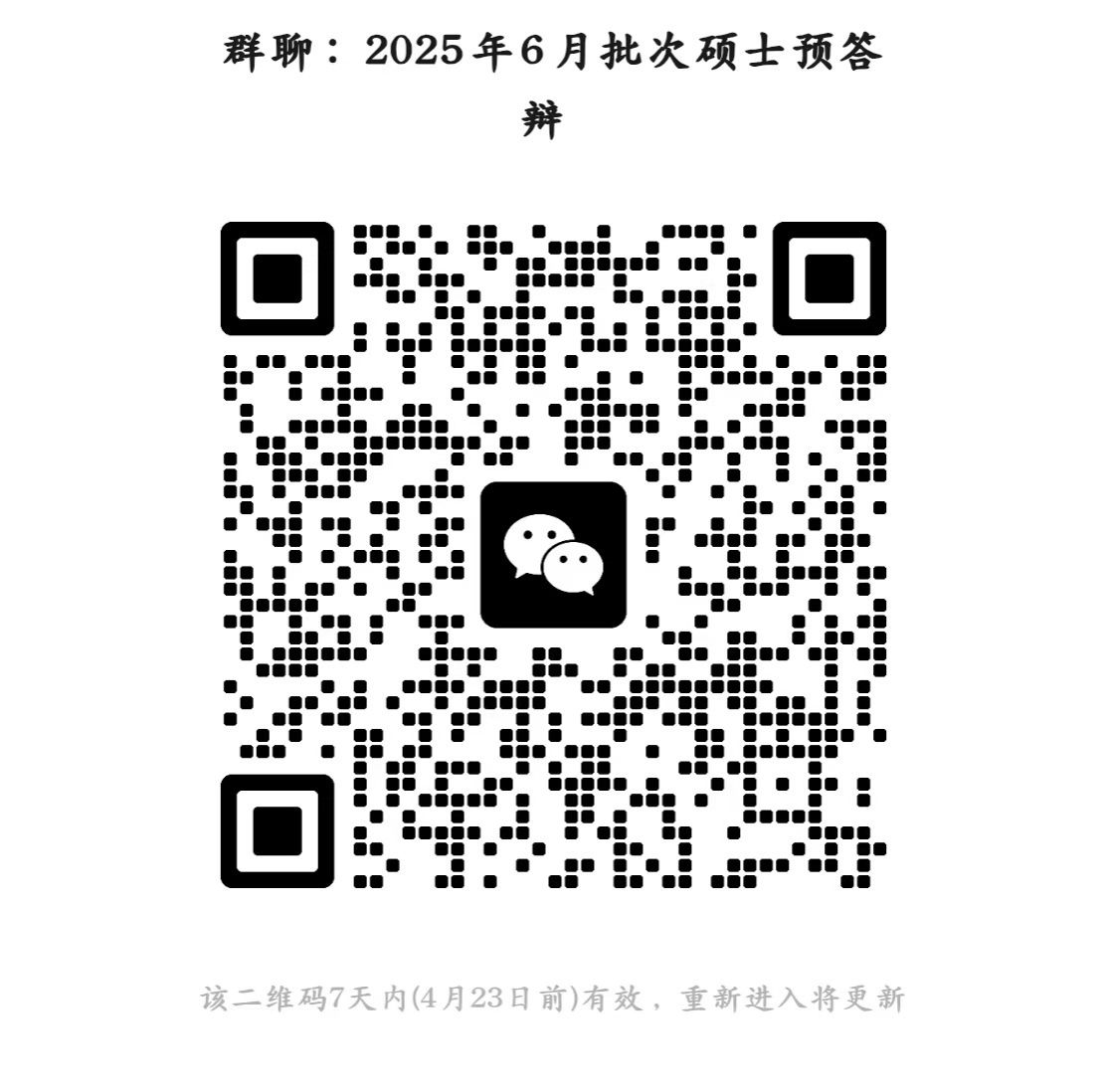 预答辩时间暂定于2025年4月29日,预答辩地点另行通知,请参加预答辩的硕士研究生扫描下方二维码进入群聊,关注群内通知。