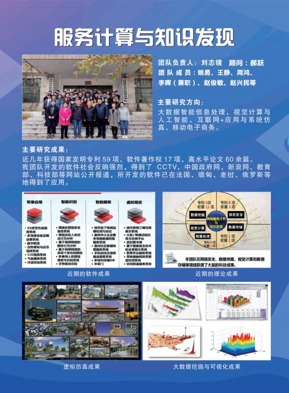 本团队核心技术主要汇聚在大数据智能信息处理、视觉计算和信息安全关键技术、移动电子商务等与应用领域。本团队的顾问为中国科公司郝跃院士。团队的主要优势在服务软件与平台的开发。在开发方面注重产品化,系统开发严格遵循软件工程开发流程与规范,近十年来开发的软件产品近50个,软件开发按期完工率为98%。