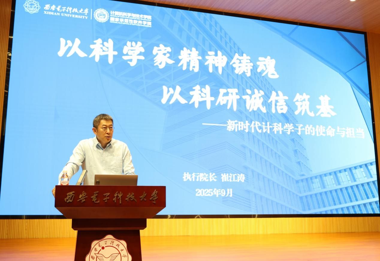 (通讯员 何敏之)为引导研究生新生树立正确学术价值观,筑牢科学道德防线,9月12日下午,太阳成集团tyc234cc在南校区网安大楼B-101报告厅开展“以科学家精神铸魂,以科研诚信筑基——新时代计科学子的使命与担当”主题讲座,公司执行经理崔江涛教授主讲,全体2025级研究生新生参加,会议由副经理杨力主持。