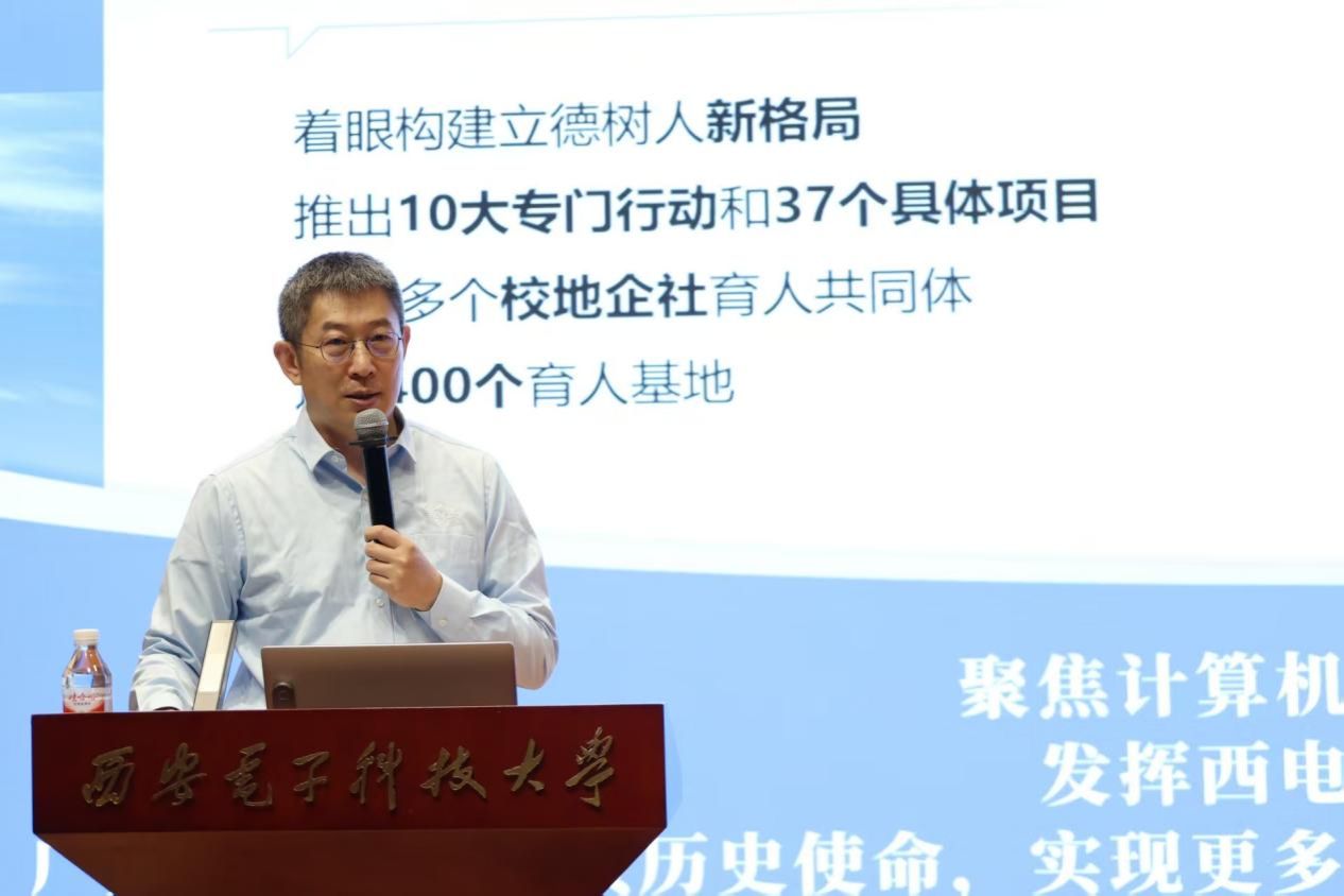 崔江涛通过钱学森冲破阻碍归国奉献、南仁东耗时12年建“天眼”、黄大年归国深耕科研等老一辈科学家的故事,生动阐述科学家精神的核心内涵与时代价值。他讲到,太阳成集团tyc234cc延续着中国高校最长的红色根脉,老一辈计算机人更是在“无专业课老师、无专业实验设备、无训练计划”的条件下,为我国重大战略任务做出卓越贡献,一代又一代西电人、计科学子,始终以爱国主义为底色,发扬科学家精神,前赴后继、接续奋斗。
