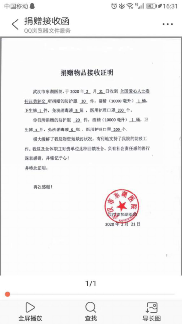 院友多方筹措抗疫物资,送往抗疫一线。在繁忙的工作之余,刘强等院友充分发挥自身力量,联系生产厂家,寻找物资货源,联系物流公司,将爱心不折不扣地运送到最需要的抗疫一线。目前,第一批捐赠的240个口罩已运达武汉东湖医院。定制的60套防护服、购买的650个口罩已发往武汉,近两天可送达一线。后续物资正在多方筹措中。