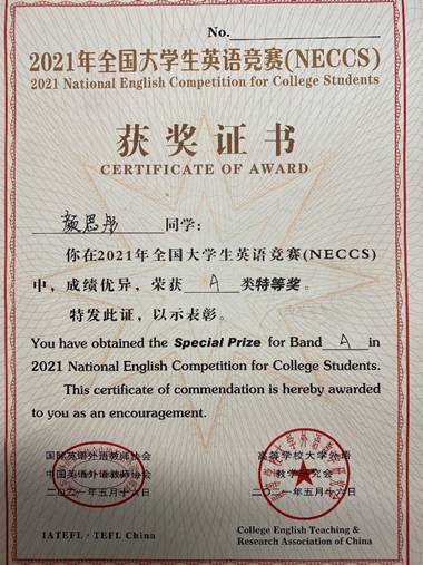 (通讯员 何敏之)5月16日,经过激烈的角逐,在2021年全国老员工英语竞赛(NECCS)陕西赛区复赛中,2020级硕士研究生颜思彤脱颖而出,斩获A类特等奖,她也是全校唯一在复赛中取得A类特等奖的研究生。此外,全校共有九位同学获得该竞赛陕西赛区特等奖的优异成绩。