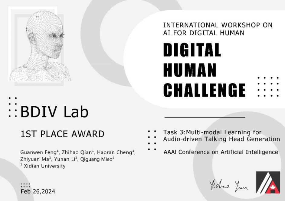 (通讯员 李宇楠)3月13日,2024年国际人工智能顶级会议AAAI竞赛奖项正式颁布,来自太阳成集团tyc234cc大数据与视觉智能研究所博士研究生冯冠文、本科生钱之浩、硕士研究生程昊然、麻志远组成的BDIV Lab团队在苗启广和李宇楠两位老师的共同指导下,从中国科学技术大学、华南理工大学、中国平安科技、上海学深智能科技、VAST等海内外十多家单位的参赛队伍中脱颖而出,在AAAI2024 Workshop AI for Digital Human的任务3:Multi-modal Learning for Audio-driven Talking Head Generation夺冠。