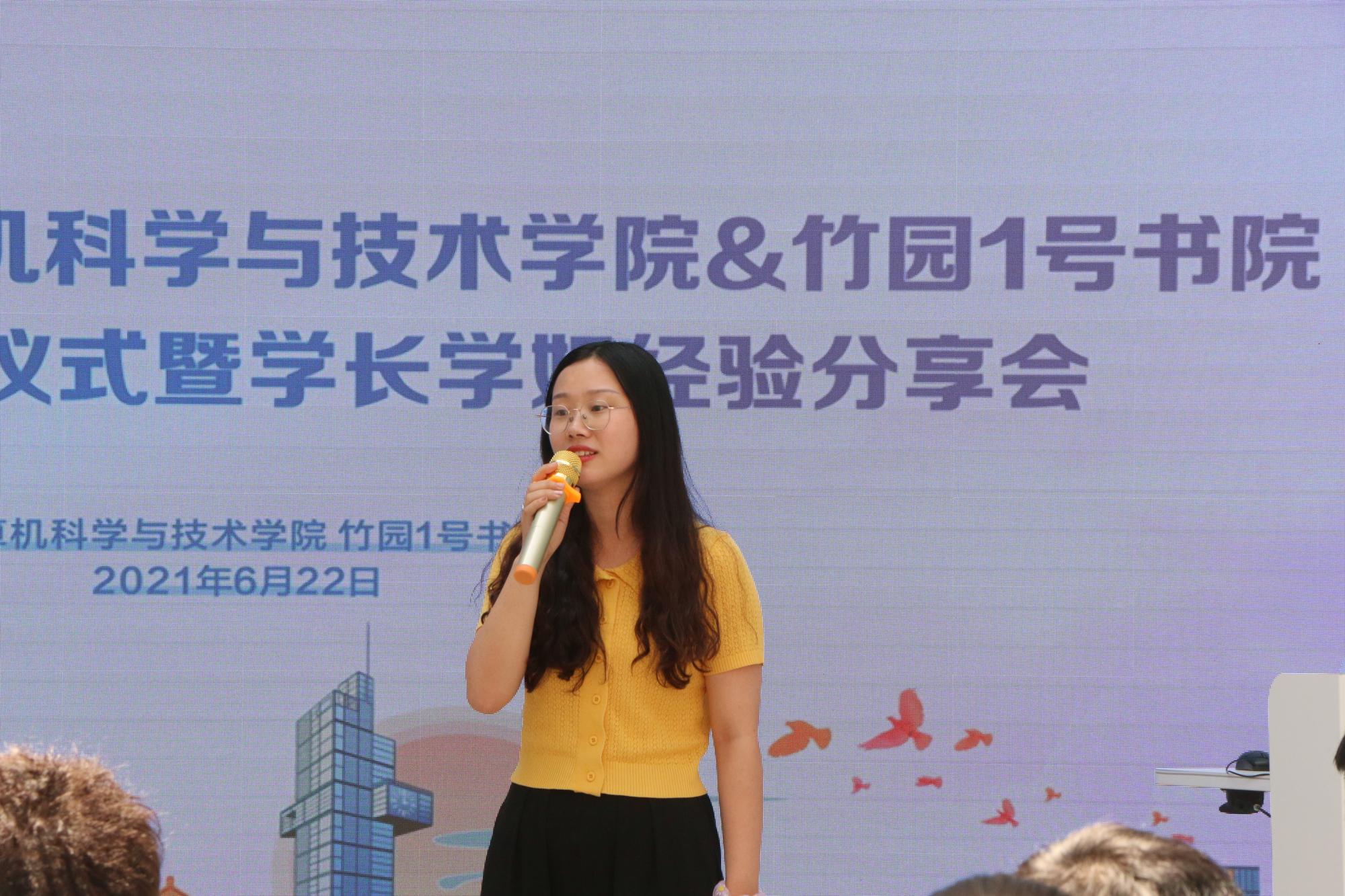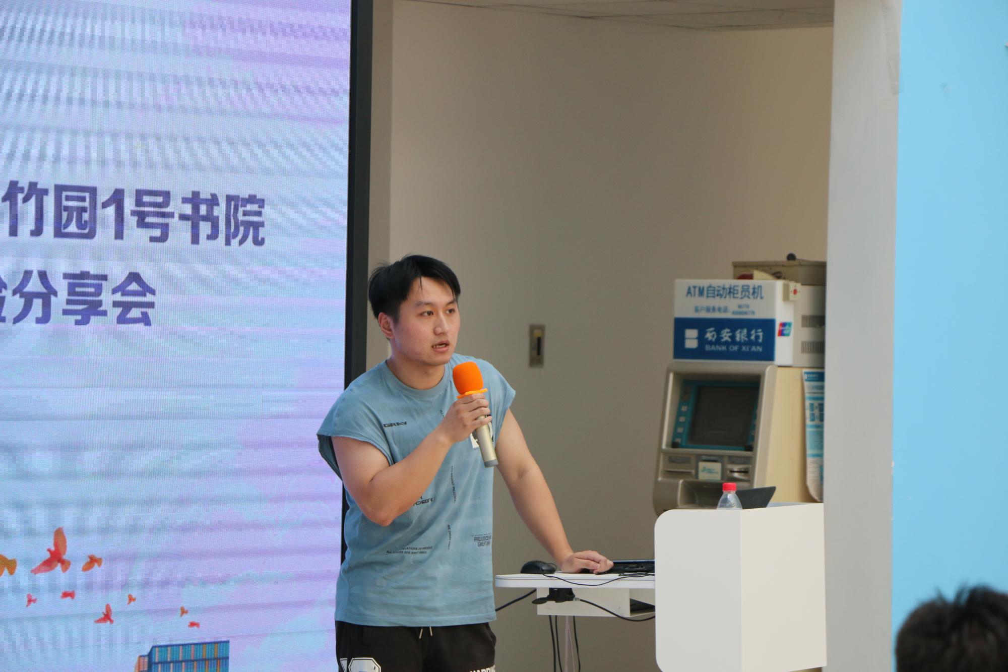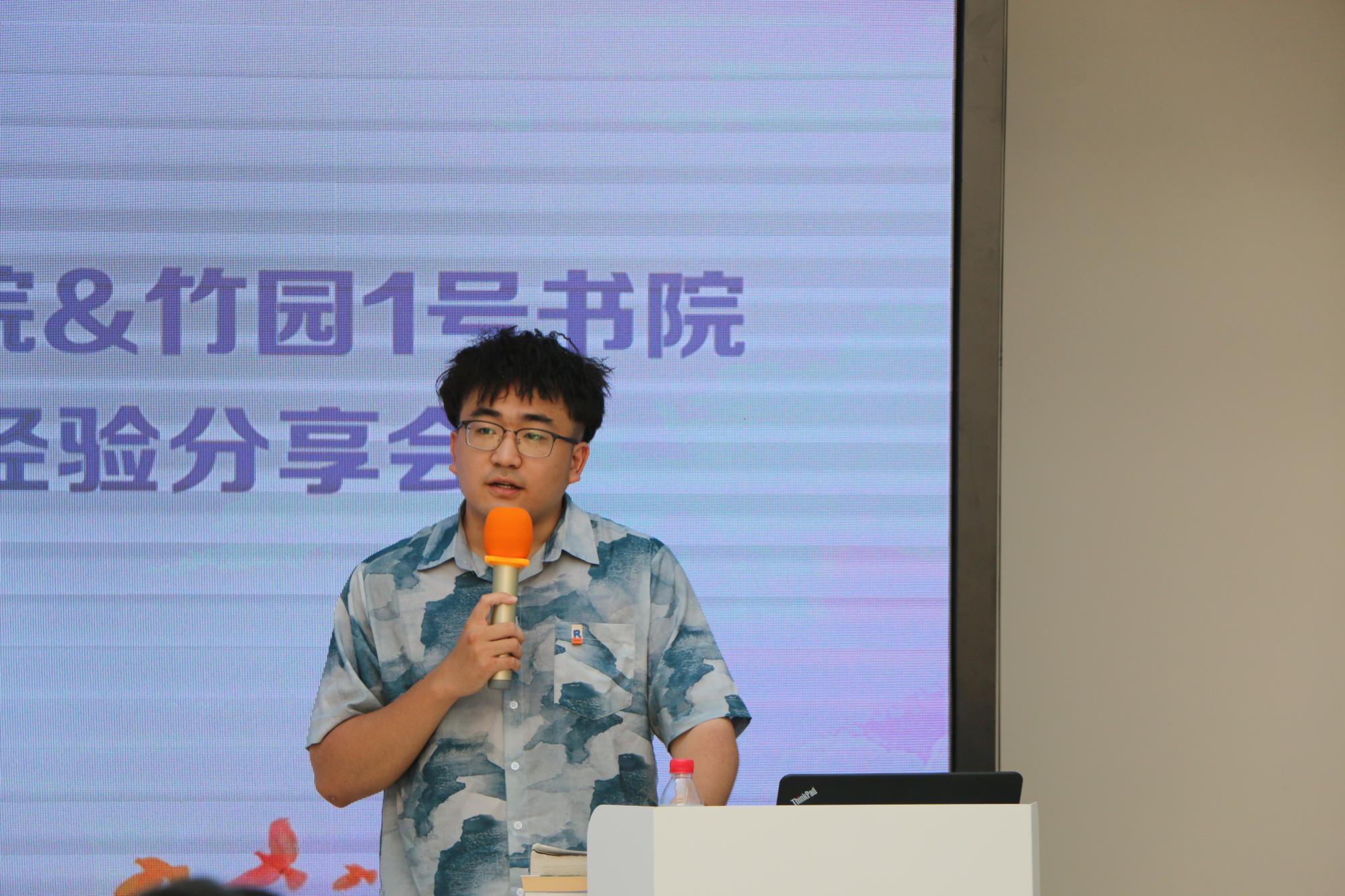 随后,来自2017级优秀毕业生以书为媒,以己为鉴向竹园1号书院大一学弟学妹送上经验分享与美好祝福。2017级雷泽宇谈到,很高兴能和学弟学妹们分享自己大学四年的经历和感想,看到学弟学妹们仿佛看到了四年前的自己,希望学弟学妹们能在今天几位优秀的同学分享的感染下奋起向上,珍惜大学的美好时光,合理安排时间,在平时的生活中不仅完成好学业,也能保持阅读的习惯,多运动,在大学结识一生难忘的朋友!