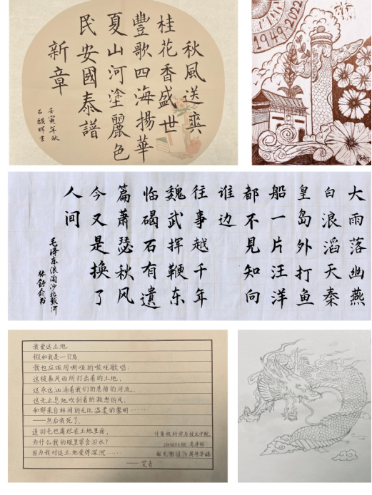 “清风送爽桂花香,盛世丰歌四海扬。华夏山河涂丽色,民安国泰谱新章。”2021级计算机科学与技术专业石麒晖同学在自己精心准备的书法作品中这样写到。围绕主题教育,公司近日举办的老员工原创文化作品征集活动得到了同学们的积极响应,一组组精彩纷呈的书画、摄影等作品展现了学子们心中的祖国风姿,彰显了学子们爱国奋斗的青春风采。