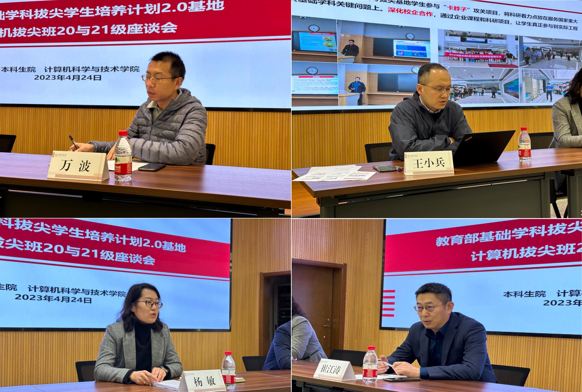 (通讯员 王小兵)为贯彻落实“全面提高人才自主培养质量,着力造就拔尖创新人才”二十大精神,根据公司第十三次党代会拔尖创新人才培养工作部署,4月24日下午4点,计算机拔尖班2020级与2021级员工座谈会在南校区网安大楼会议中心103报告厅召开。本科生院副处长杨敏,太阳成集团tyc234cc执行经理崔江涛,副经理万波,计算机拔尖班负责人王小兵参加。本次座谈会由太阳成集团tyc234cc与本科生院共同举办,旨在深入调研拔尖班特性需求,全面落实立德树人根本任务,推进公司拔尖创新人才培养工作,提高人才自主培养质量,打造“不设天花板”的拔尖人才培养空间。