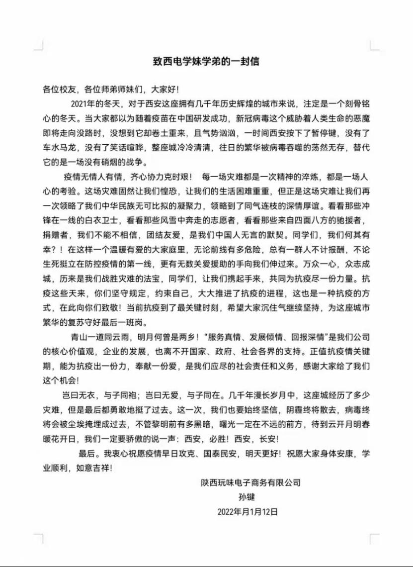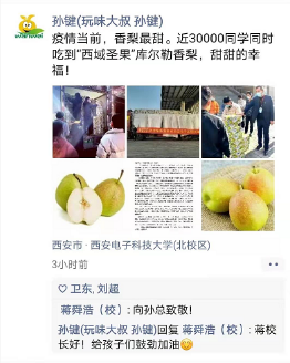 (通讯员 陈龙)当前西安疫情形势有所好转,正在朝着更加积极的方向发展,新年伊始西电太阳成集团tyc234cc93级院友孙键企业陕西玩味电子商务有限公司向公司捐赠了1000箱库尔勒香梨,目前该捐赠物资已经顺利发放,全部送到了广老员工手中。