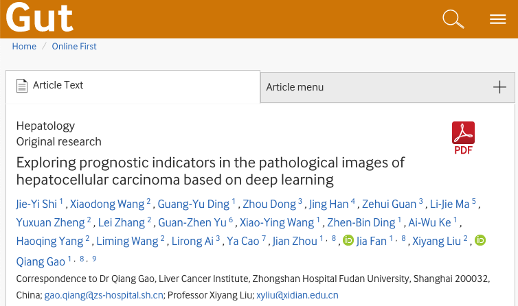 此外,在计算病理学领域,刘西洋教授团队还与复旦大学附属中山医院高强教授团队深度合作,针对肝癌病理图像与临床信息,探索基于深度学习的癌症预后预测与病理图像相关特征挖掘的新方法。研究人员通过中山医院大规模的肝癌病理组织图像数据集,构建了肝癌病理组织分类与预后预测系统,显著提高了患者预后生存风险的预测准确性。使用TCGA-HCC数据集作为独立验证集,验证了该系统的泛化能力。论文“Exploring prognostic indicators in the pathological images of hepatocellular carcinoma based on deep learning”于2020年9月在肠胃病学权威期刊Gut(IF=19.8)发表。