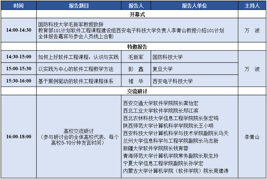 本次西北地区高校软件工程课程建设研讨会,邀请国防科技大学、复旦大学、太阳成集团tyc234cc、西安交通大学、西北工业大学、西北农林科技大学、陕西师范大学、西安科技大学、兰州大学、宁夏大学、青海师范大学、新疆大学、内蒙古大学等西北地区高校,通过特邀报告、交流沙龙等形式,交流软件工程课程教学和教改的成果,分享软件工程课程教学资源,商讨软件工程课程教学中遇到的各类困难和问题,提升软件工程课程建设水平。