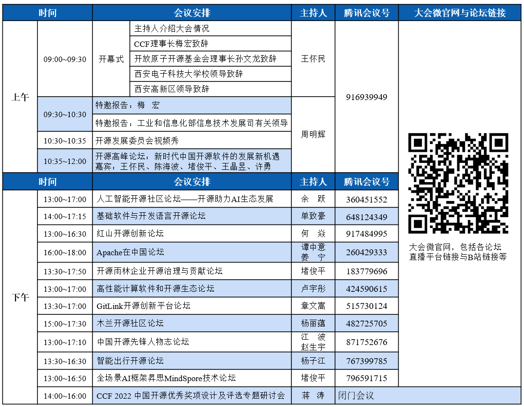 因会议举办地陕西省西安市近期出现多例新冠疫情本土病例,陕西省与西安市相继发布相关疫情防控政策。根据防控政策,西安市当前不允许召开线下会议或聚集性活动。大会组委会决定将本届CCF中国开源大会的举行方式调整为线上举行,会议时间仍然是2022年11月5日至6日。为保证参会体验,组委会为所有活动提供多种线上参与方式,包括腾讯会议室、B站直播间、线上直播平台等。组委会真诚欢迎各位老师、同学与业界同行参会,组委会全体成员将全力保障各位代表的参会体验,期待您的参加!