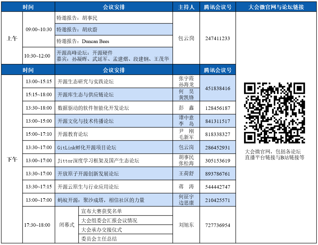 11月5日-6日包含大会各项活动,为保证各位代表的参会体验,大会组委会准备了多种线上参与方式,包括各分论坛腾讯会议室、B站直播间、线上直播平台等。下面是本次会议的线上参与服务指南,请各位参会代表查看。