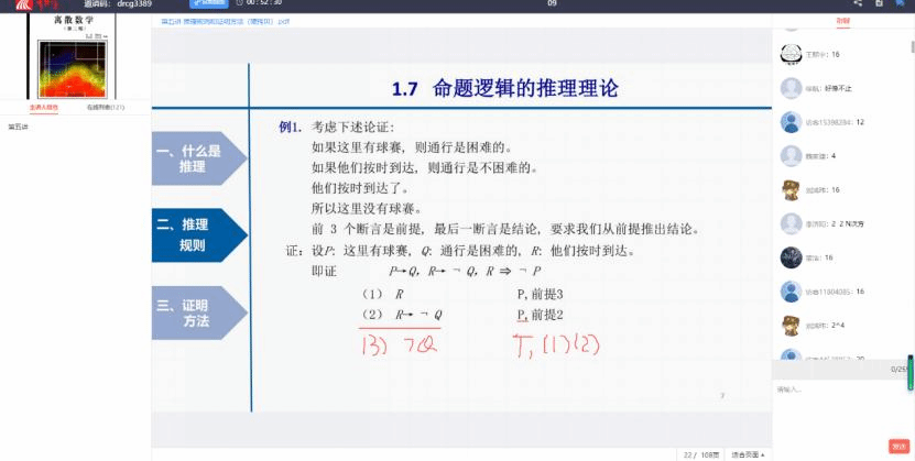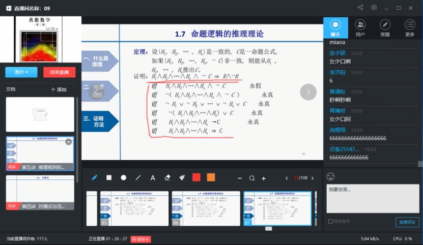 由谢琨老师进行直播,谢琨作为校青年教师讲课竞赛一等奖的获得者,教学经验丰富,而郑海红老师作为骨干教师,对离散数学教学也有自己的一套心得。两位优秀教师“一拍即合”,成立“离散双师组”,正式开启“双师”教学模式。经过细致的教学研判,两位老师最终确定了课程学习围绕“提振信心——引入问题——导出概念——分析讨论——解决问题——延伸问题”这一线索进行,引导员工主动思考,营造课堂教学氛围。同时利用信息化平台创新设计多种互动方式,讨论区主题辩论、疑点问题答题卡、“击鼓传花”随机答等。当谢琨老师“讲”的时候,郑老师实时联动,负起“教”的责任,及时回答员工的提问、处理员工的突发情况、并快速记录和梳理课程的相关信息,及时发起疑点问题答题卡,插入“击鼓传花”随机答等互动模式,拓展了课堂的教学手段与方法,锁定了课堂关键知识点,活跃了课堂氛围。