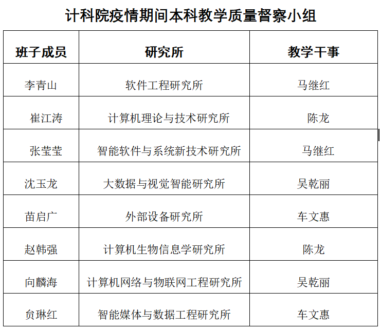 精细化管理,网格化督查。公司成立了以院领导和办公室主任为主体的线上教学督导组,针对8个研究所的全体老师形成“网格化”督查模式。上课前,所有课程的链接、二维码、课堂暗号等,由教务干事全部收集发到督查群。随时收集员工对教学质量的反馈意见,发现问题,解决问题,做好线上教学的自我监控和员工的舆论引导工作。