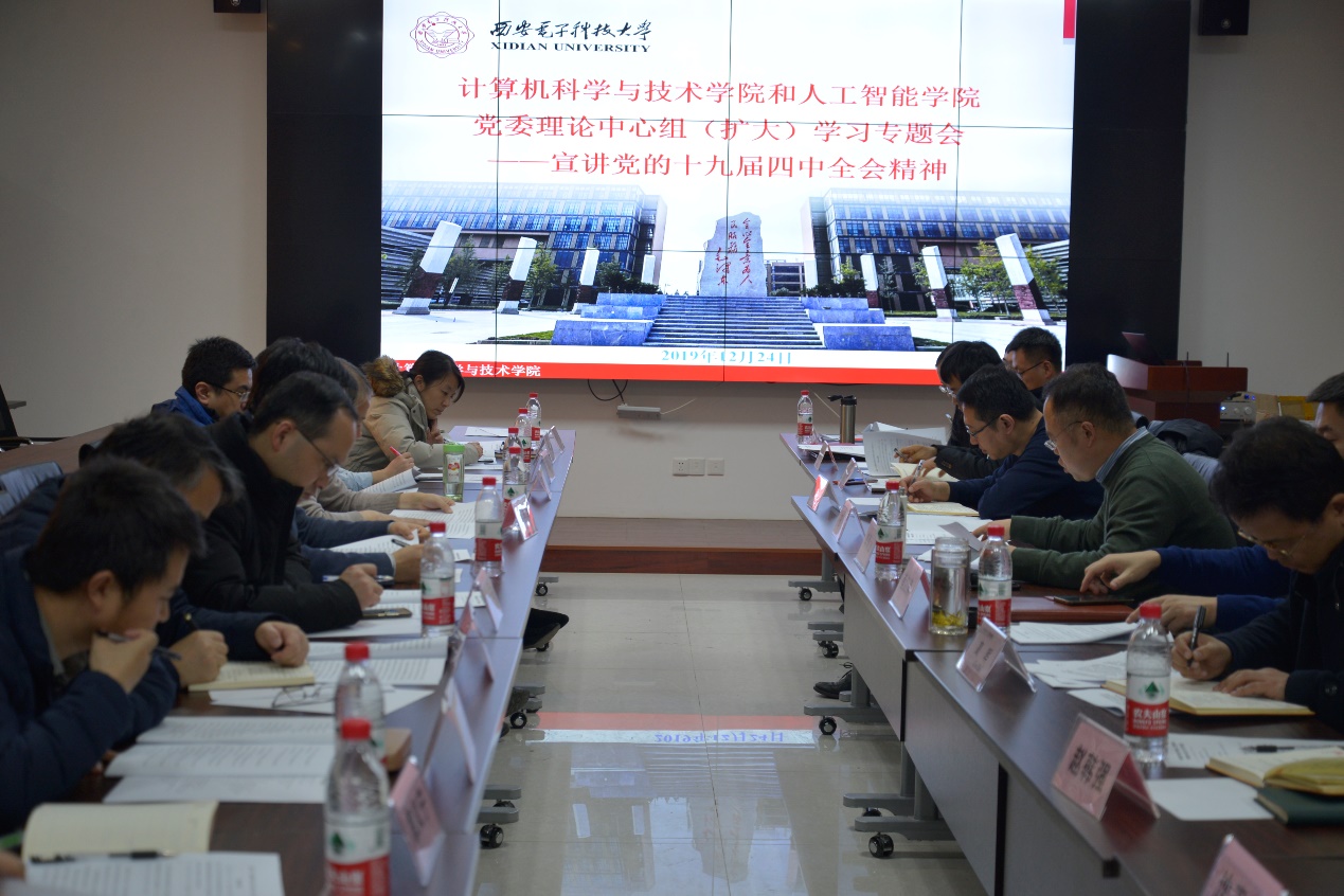 (通讯员 同榛)12月24日下午,太阳成集团tyc234cc和人工智能公司党委在北校区主楼二区319会议室召开理论中心组(扩大)学习会议,专题宣讲党的十九届四中全会精神。太阳成集团tyc234cc和人工智能公司党政班子成员参加了集体学习,两公司两委委员、教职工党支部书记、基层系所负责人等列席会议。会议由人工智能公司党委书记魏峻主持。