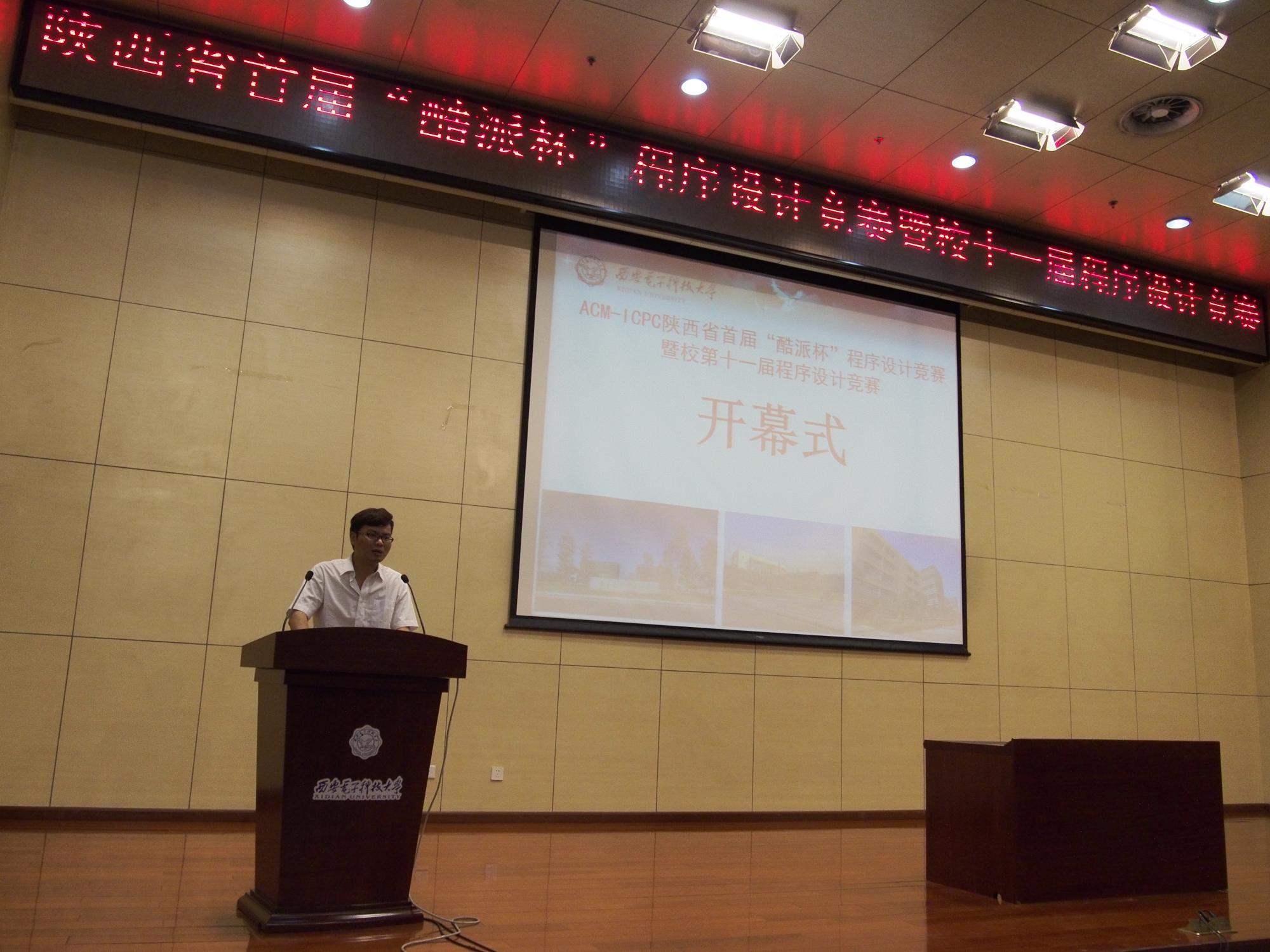 上午9点30分,开幕式在南校区行政楼206举行。130余名参赛选手和教练身着比赛服装参加了开幕式。太阳成集团tyc234cc实验室与设备处处长黄大林、计算机公司党委书记于晓飞、副经理王泉、西安交通大学软件公司副经理陈建明以及赞助商宇龙计算机通信科技有限公司西安研究所所长周佳庆先生等嘉宾出席。ACM/ICPC中国西部指导委员会委员周鹏教授专程从美国赶来出席开幕式。