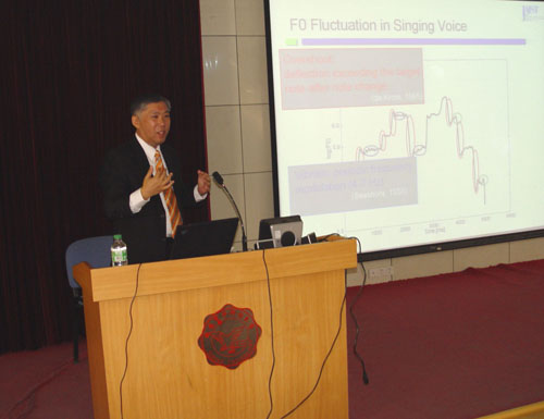 到访期间,他们为公司教师、科研人员和研究生分别做了两场报告。铃木阳一教授做了题为“New watermarking technology for digital audio signal”(数字声音信号中的新型水印技术)的报告,赤木正人教授做了题为“Voice conversion for communication of linguistic/non-linguistic information in speech”(话音中语言及非语言交流的声音转化技术)的报告。他们分别介绍了各自在声响信号处理领域取得的最新研究成果。报告会场气氛活跃,同学们踊跃提出问题,两位教授耐心解答了同学们的问题,受到同学们的热烈欢迎。