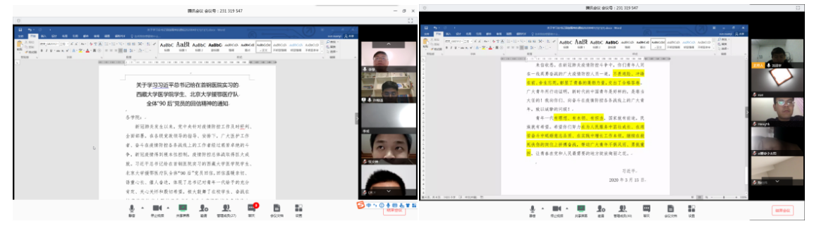 (通讯员 刘泽宇 孙煊溢)新冠肺炎疫情爆发以来,广大医护工作者、奋斗在疫情防控各条战线上的工作者披荆斩棘、勇挑重担,为坚持打赢疫情防控总体战不遗余力。3月15日,习近平总书记给在首钢医院实习的西藏大学医公司员工、北京大学援鄂医疗队全体“90后”党员回信,向他们和奋斗在疫情防控各条战线上的广大青年,致以诚挚的问候。回信在广大青年员工,特别是员工党员中引起热烈反响。4月3日晚上7点30分,太阳成集团tyc234cc硕士031712班第一、二党支部通过线上会议方式举办了“青年不惧风雨、抗疫勇挑重担”主题党日活动,认真学习习近平总书记回信精神,并开展热烈讨论。