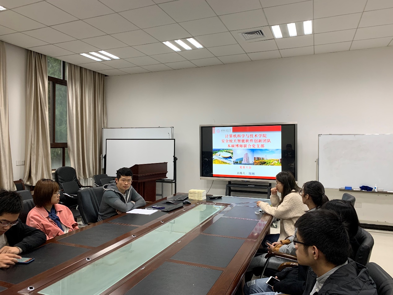 首先,陆旭同志介绍支部目前的情况及支部特色,并为解决南北校区统一开展活动不便的问题,除党员大会、主题活动外,其他以南北校区分别开展学习的形式进行。同时,简要汇报了近期党员轮训的进展。