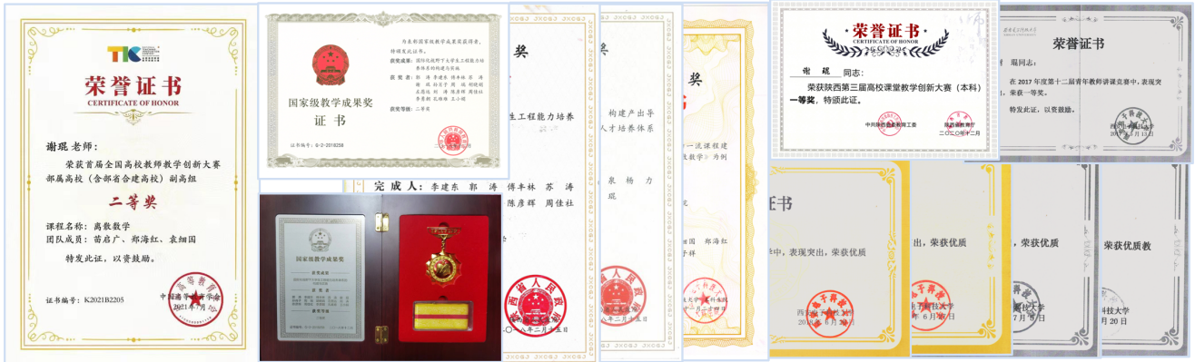 矢志创新,推动教改。在长期的一线教学工作中,谢琨同志积累了大量的经验,进行了深入的人才培养和本科教学工作的探索与实践。近五年主持教育部、省校级教改项目12项,其中省级重点项目4项,作为主要完成人参与教学改革项目8项;在CSSCI、中文核心等期刊发表教改论文9篇。作为课程负责人获首批陕西省线下一流课程1门,2021年被推荐国家级线下一流课程评选(在评)。经过长期的探索实践,教学改革成绩显著:获首届全国高校教师教学创新大赛二等奖(西电唯一),国家级教学成果奖二等奖,陕西省教学成果特等奖、一等奖、二等奖各1项,陕西省高校课堂教学创新大赛一等奖,第三届全国“互联网+”老员工创新创业大赛优秀导师奖和首届全国“互联网+”老员工创新创业大赛陕西赛区优秀导师奖,陕西省高校教师微课教学比赛三等奖,太阳成集团tyc234cc第十二届讲课竞赛一等奖,太阳成集团tyc234cc优秀教学质量奖一等奖等校级以上教学奖项近30项。