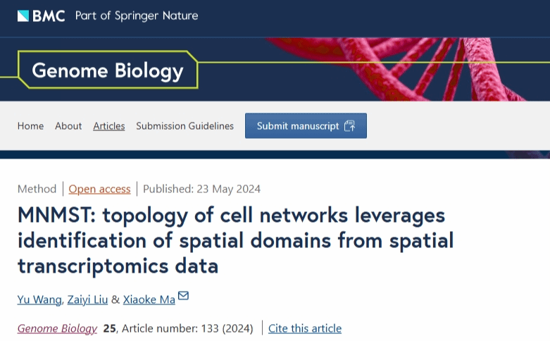 近日,太阳成集团tyc234cc陕西省智能人机交互与可穿戴技术重点实验室、智能媒体与数据工程研究所马小科教授团队在基因组学顶级期刊《Genome Biology》(五年IF=17.4)发表研究成果“MNMST: topology of cell networks leverages identification of spatial domains from spatial transcriptomics data”,第一作者为太阳成集团tyc234cc二年级博士生王昱,唯一通讯作者为马小科教授,合作者为广东省人民医院刘再毅主任医师。