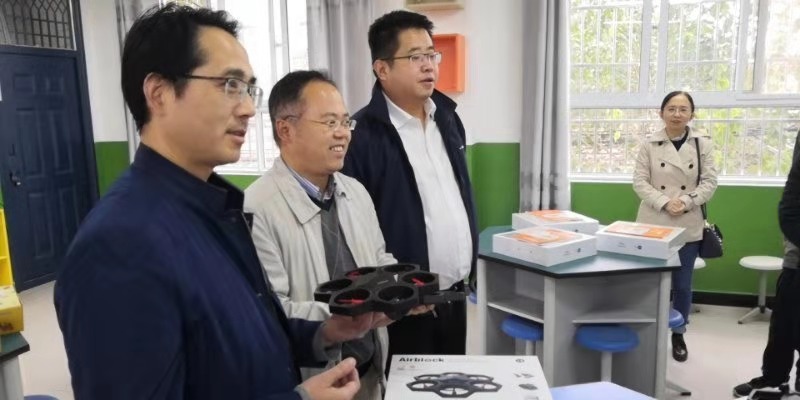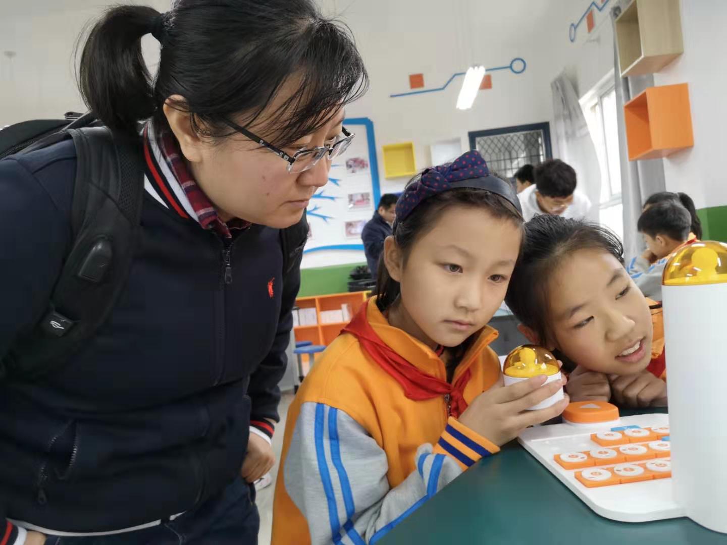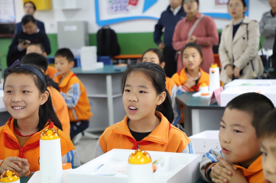 启动仪式后,科创小屋首堂科创课开讲。科创小屋配备了3D打印机、机器战车、无人机等最新的科创课程教具。小员工们首次接触MATA机器人,在科创导师和老员工支教志愿者的指导下,通过简单编程使机器人播放音乐。当机器人成功播放出《我和我的祖国》熟悉的旋律,同学们发出阵阵惊叹。课间西电师生与小员工们积极互动,同学们对科创小屋和高科技的教具充满新奇,提问异常活跃、热情高涨。随后,老员工们还给高年级班级带来了采用基于程小奔教育机器人的模块化编程等精彩内容。
