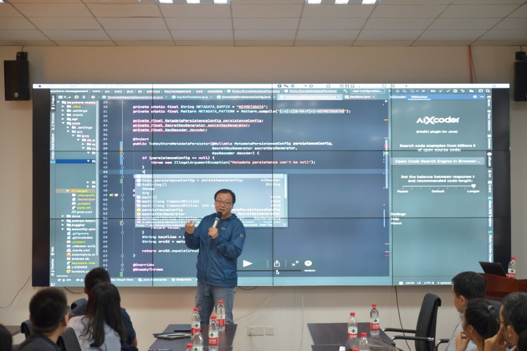 李戈副教授首先带来了题为“代码生成——AI与软件研究者的共同梦想”的报告,与在座师生交流了代码自动生成方向的最新进展。作为人工智能与软件工程交叉领域的代表性问题,李老师首先对代码生成的代表性成果进行了总结,并对所在研究团队在基于深度学习的代码分析与生成等方面的研究工作进行了讲解。李老师的工作聚焦在如何在软件开发过程中使用人工智能技术,减少开发人员的工作量,提升开发效率。作为最早开展基于深度学习的程序分析与生成研究的团队之一,李老师还向在座师生讲解了所在研究团队的研究历程。最后,李老师介绍了研究团队发布的“aiXcoder智能编码引擎”的最新进展与示范应用情况。