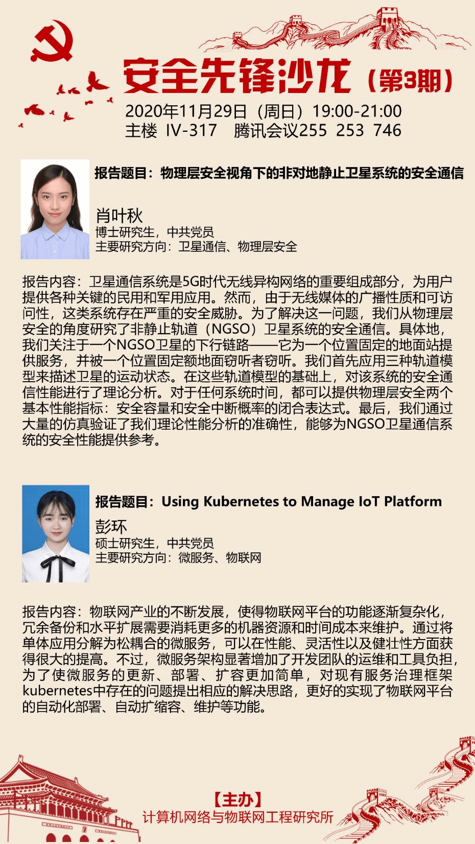 据悉,“安全先锋沙龙”主题报告活动的预期建设效果是在不同培养阶段员工之间搭建起一个学术科研交流的常态化平台,是计算机网络与物联网工程研究所落实三全育人要求,践行“推进党建和业务融合应常态化制度化”的积极探索与实践。活动每两周进行一次,每期组织安排研究所各个方向的博士和硕士研究生分别介绍各自专业领域的理论与技术新进展,欢迎对计算机网络、物联网、云计算及其安全主题感兴趣的师生通过线上或线下的方式参与。