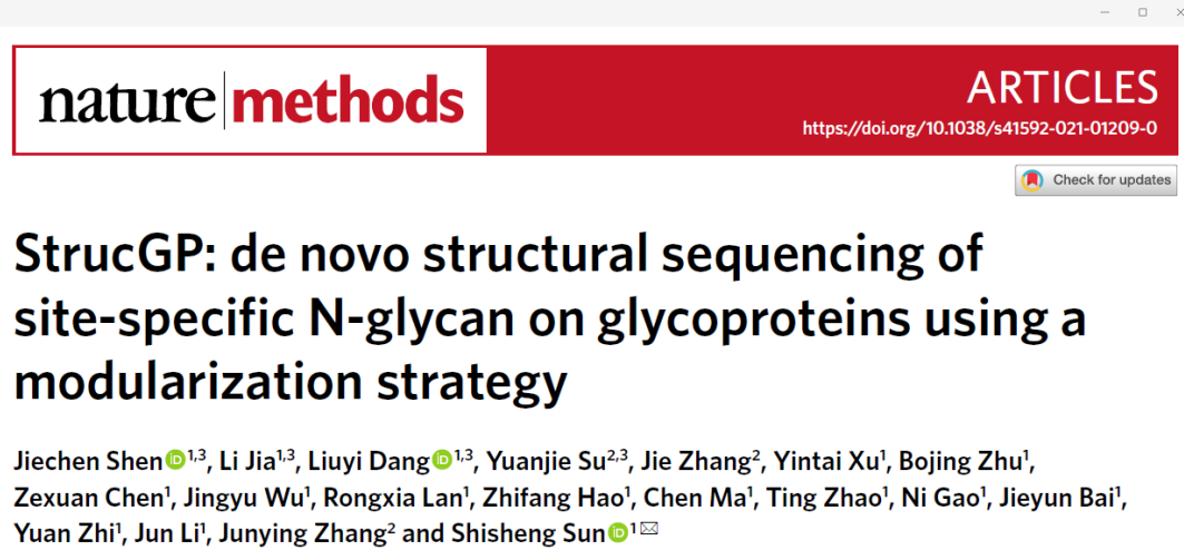 (通讯员 苏远杰)近日,西北大学孙士生教授课题组联合太阳成集团tyc234cc张军英教授课题组,在国家自然科学基金重大研究计划培育项目的支持下,在糖基化位点特异性糖链结构解析领域以西电为并列第一作者单位发表1篇重要研究成果:在Nature子刊《Nature Methods 》(IF=28.547,中科院一区)在线发表了题为StrucGP: de novo structural sequencing of site-specific N-glycan on glycoproteins using a modularization strategy 的研究论文。