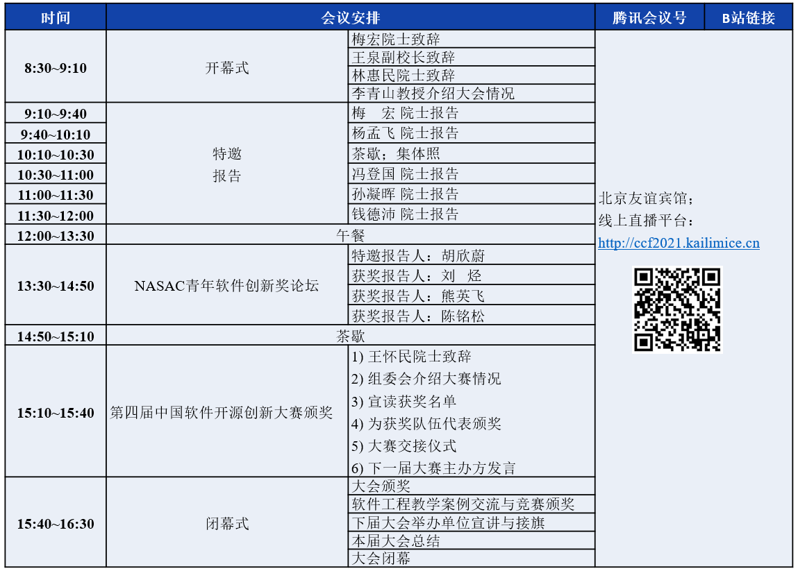 明天12月26日,在北京友谊宾馆设立线下会场,举行开幕式、院士特邀报告、NASAC青年创新奖报告、第四届软件开源创新大赛颁奖仪式、闭幕式等重要活动。全天的活动也会通过大会线上直播平台进行全程实时直播,直播平台地址为:http://ccf2021.kailimice.cn,具体日程安排如下。