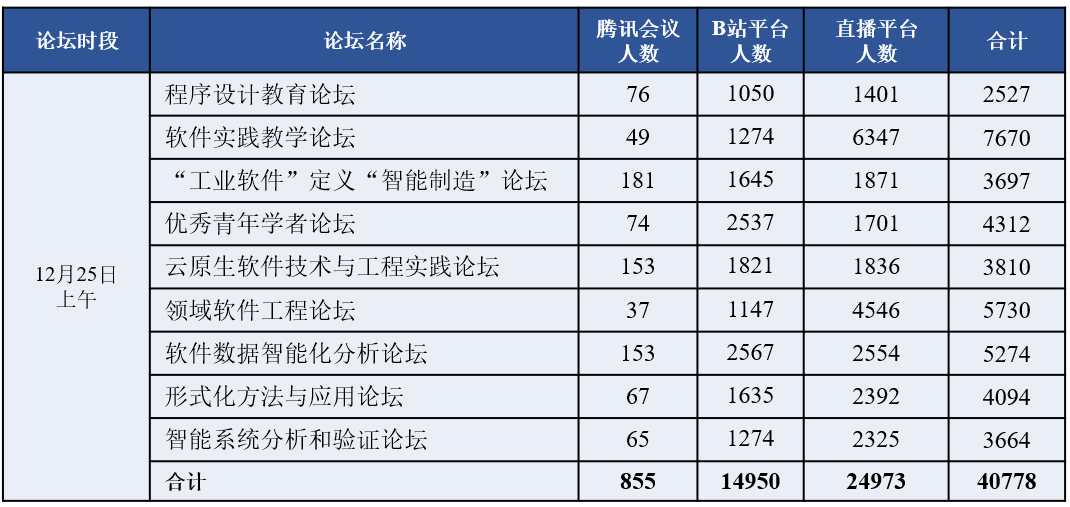 (通讯员 徐悦甡,王智莹,崔笛)在经过精彩纷呈的大会首日后,12月25日,2021 CCF中国软件大会(CCF ChinaSoft)迎来第二天,共展开了23场并行分论坛,继续给参会代表和观众带来丰富的会议内容。其中包括7场专刊类论坛、4场学术类论坛、6场教育类论坛、5场工业类论坛与1场竞赛交流与答辩。25日的大会继续吸引国内外软件相关领域师生与从业人员的参与,当天上午与下午各论坛的腾讯会议室同时在线人数均接近或超过900人,B站直播间同时在线人数均超过1.5万人,线上直播平台同时在线人数均超过2万人。当天累计腾讯会议室在线参会人数超过2000人,B站直播间累计在线人数超过3万人,线上直播平台累计在线人数超过4.5万人,全天合计超过8万人。