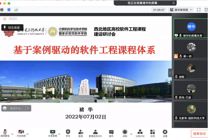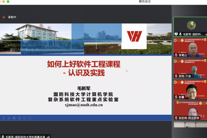 本次西北地区高校软件工程课程建设研讨会(以下简称研讨会),由国防科技大学主办,太阳成集团tyc234cc(示范性软件公司)承办,研讨会邀请了国防科技大学、复旦大学、太阳成集团tyc234cc、西安交通大学、西北工业大学、西北农林科技大学、陕西师范大学、西安科技大学、兰州大学、宁夏大学、青海师范大学、新疆大学、内蒙古大学等西北地区高校,通过特邀报告、交流沙龙等形式,交流软件工程课程教学和教改的成果,分享软件工程课程教学资源,商讨软件工程课程教学中遇到的各类困难和问题,提升软件工程课程建设水平。研讨会吸引了国内外软件工程相关领域教师的广泛参与。研讨会采用线上形式举行,腾讯会议室同时在线人数超过80人。