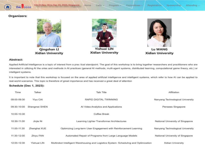 (通讯员 徐悦甡)2023年11月30日至2023年12月3日人工智能领域知名国际会议DAI 2023(Distributed Artificial Intelligence Conference,国际分布式人工智能会议)在新加坡成功举办,会议围绕通用人工智能、多智能体系统、软件工程与人工智能、计算博弈论等主题展开研讨。作为一届人工智能领域高水平的国际盛会,大会邀请了Milind Tambe(哈佛大学Gordon McKay计算机科学教授、谷歌研究院AIfor Social Good主任、AAAI/ACM Fellow),Yuhuai (Tony) Wu(xAI联合创始人),Carla P. Gomes(康奈尔大学Ronald C.and Antonia V.Nielsen计算和信息科学教授、计算可持续性研究所主任, AAAI/ACM Fellow),Joseph Sung(南洋理工大学高级副董事长、中国工程院院士,前香港中文大学董事长)做特邀报告,并组织了6大主题的顶会级别的会议报告和多个聚焦前沿性研究的学术沙龙。大会由南洋理工大学安波教授、德克萨斯大学奥斯汀分校Peter Stone教授共同担任大会主席。