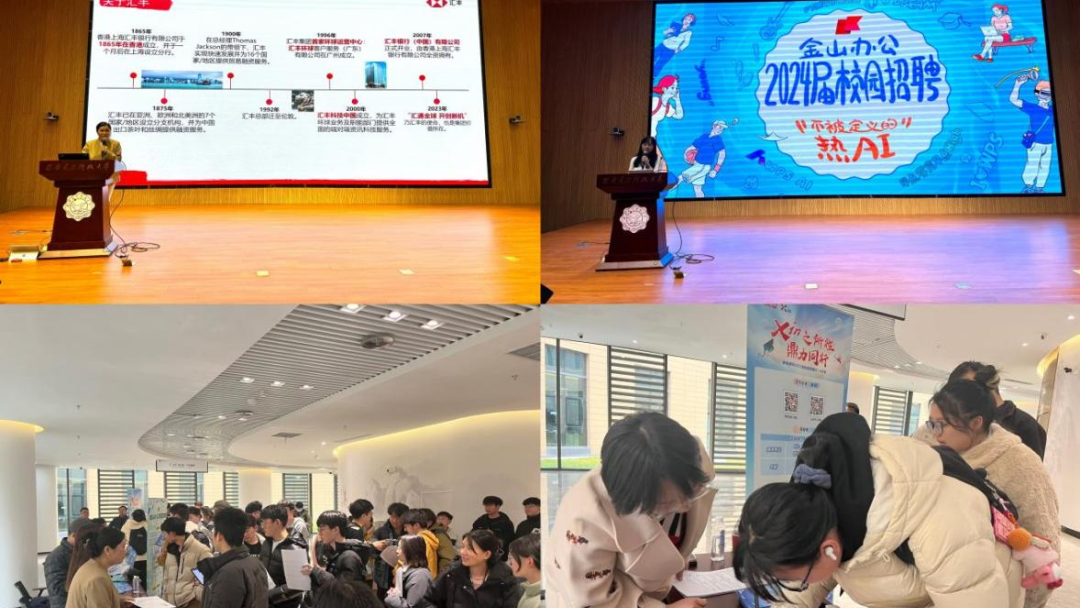 专题周点名现场搭起就业推荐平台,邀请了汇丰科技中国、金山办公、鼎信通讯、华讯网络四家企业作宣讲和现场招聘。会后全体参会员工,前往招聘咨询工作台与企业热情交流,投递简历,取得良好效果。