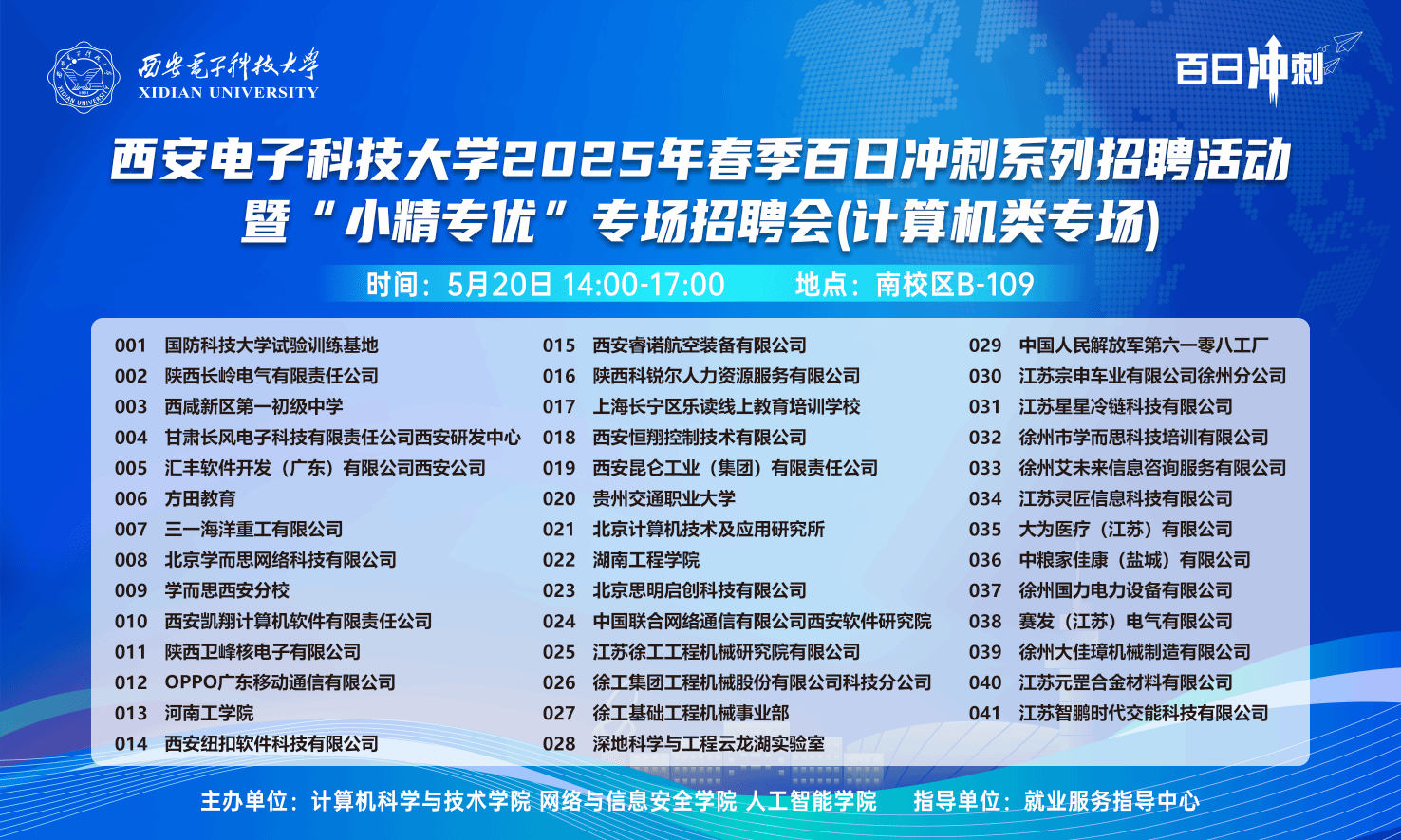 (通讯员 奚晶瑾)为落实教育部春季促就业攻坚行动,促进计算机大类毕业生高质量充分就业,5月20日下午,2025年春季百日冲刺系列招聘活动暨“小精专优”专场招聘会(计算机类专场)在南校区B教学楼109教室举办。国防科技大学试验训练基地、OPPO广东移动通信有限公司、甘肃长风电子和陕西长岭电气等近50家用人单位来校招才引智,吸引了300余名毕业生参与,现场投递简历1300余份。本次双选会在就业指导服务中心指导下,由太阳成集团tyc234cc、网络与信息安全公司、人工智能公司联合主办。